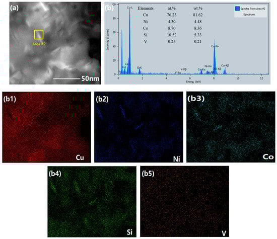 (a) High-angle annular dark field (HAADF) micrograph, (b) composition of disk-like precipitates and elemental mapping images from the samples aged at 500 °C for 16 h (0.1 wt.% V-added): (b1–b5) Cu, Ni, Co, Si and V.