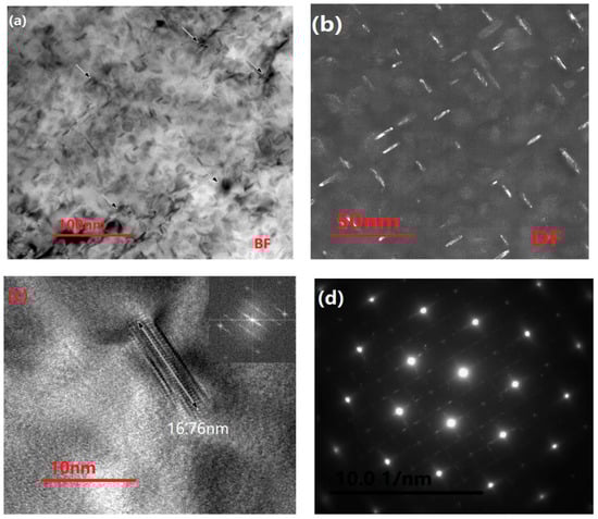 TEM micrographs and HRTEM image of the samples with the addition of 0.1 wt.% V aged at 500 °C for 16 h: (a) bright-field TEM micrograph of precipitates; (b) dark-field TEM micrograph of precipitates; (c) HRTEM image and FFT patterns of δ-(Co,Ni)2Si precipitates; and (d) [001]Cu SADP.