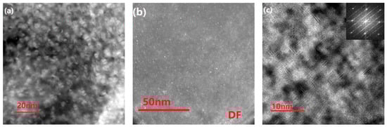 Figure 10 shows the TEM micrographs and of the HRTEM image of the samples with the addition of 0.2 wt.% V aged at 500 °C for 120 min. Figure 10a shows that more particles are precipitated in the field of view are δ-(Co,Ni)2Si and β-Ni3Si phases. Figure 10b shows that the precipitates are more uniformly distributed in the field of view, than in Figure 9b. The dimensions of the precipitates are about 21–22 nm (Figure 10c). Although the aging time was shorter, the dimensions of the precipitates were larger. This means that the addition of a small amount of vanadium could accelerate the precipitation of solute atoms from the matrix. The large coarsened precipitate particles may disadvantageously influence the hardness.