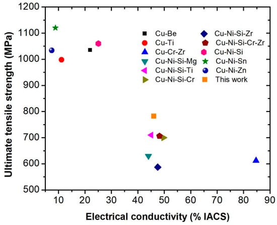 - Suzuk, S.; Shibutani, N.; Mimura, K.; Isshiki, M.; Waseda, Y. Improvement in strength and electrical conductivity of Cu-Ni-Si alloys by aging and cold rolling. J. Alloy. Compd. 2006, 417, 116–120. [Google Scholar] [CrossRef]