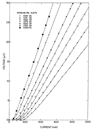 In Figure 4, we show a typical example of the flux-flow resistance. The flux-flow voltage is plotted versus the electric current in the case of a niobium foil of 18 m thickness. We see that the voltage sets in at a certain finite critical current, above which the curve turns upward and then turns into a branch increasing linearly with increasing current. The slopes of the linear branches represent the flux-flow resistance. With increasing magnetic field, the critical current decreases and the flux-flow resistance increases. The finite critical current is due to the important process of flux pinning and prevents magnetic flux motion and the generation of electric losses. In recent years, flux pinning and the introduction of suitable pinning centers have developed into an important subject of the materials science of superconductors.
