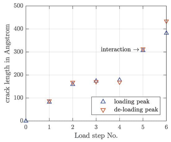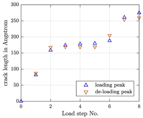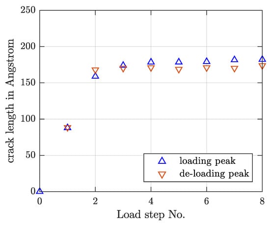 After relaxation, the model was loaded with an initial strain amplitude of = 0.04. From this state, the subsequent cyclic loading was applied. For these loading sequences, a strain amplitude of = 0.02 was used to open the crack in mode I. Equal to the loading phase, the unloading was performed by utilising a strain amplitude of = 0.02. Figure 4 shows the crack lengths at the peaks of the respective loading and unloading cycles.