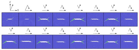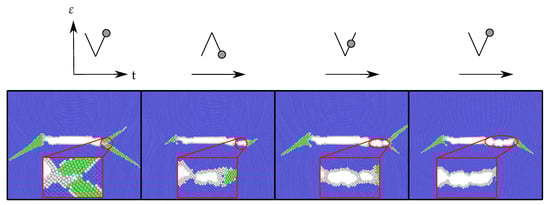 The model was built and computed using the LAMMPS code []. To simulate fatigue crack propagation, the specimen was subjected to applied strain, as shown in Figure 2, in different loading scenarios. To prohibit the healing of the crack in the compression regime as far as possible a slightly higher strain amplitude of = 0.04 was applied in the first load step. From there, the strain was applied in a cyclic fashion using a strain rate of 1.5 × 10 s. Besides the loading with a constant amplitude (a.), high-low (b.), and low-high (c.) load order was investigated. In addition, a single overload event (SOL) (d.) as well as a single underload (SUL) (e.) was also simulated. To save computational time, 8 load steps consisting of loading and unloading were computed. Before the cyclic loading was applied, the model was equilibrated using constant NVE (i.e., constant number of particles N, volume V, and total energy E of the system) time integration, whereas the temperature was controlled by utilising a Berendsen thermostat [] with a temperature of 300 K and a relaxation parameter of 0.1 ps. After relaxation, the crack was implemented by deactivating the interaction of the particles in the relevant area. By doing so, a crack was created as a discontinuity which has the same depth as the model. The timestep used in all computations was 0.001 ps and the integration of the equation of motion was performed utilising the velocity-Verlet algorithm [].