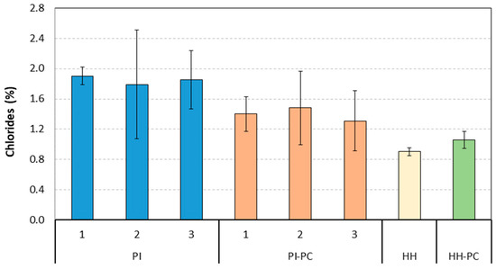 The chloride concentrations determined for the PI and PI-PC samples (Figure 3) were about 3.5% and 3%, respectively when they were related to the weight of cement. Bearing in mind the previous results reported by Gastaldi et al. [24], they imply a clear corrosion risk at room temperature under potentiostatic polarizations at 200 mV for non-aged concrete samples. The chloride concentrations for the HH and HH-PC (about 2% in relation to the weight of cement) would not imply corrosion for lean duplex bars in the conditions of the cited study [24].