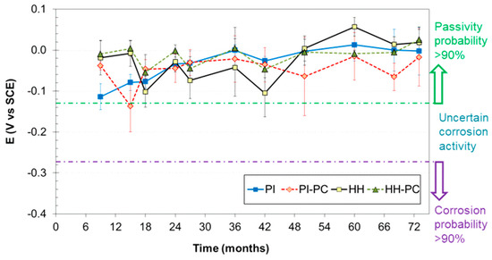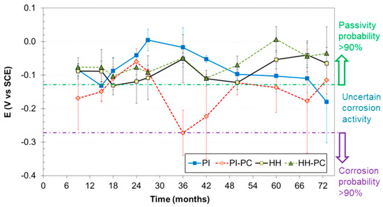The results from the Ecorr monitoring of the least-alloyed steel (S32001) are plotted in Figure 5. The samples exposed to HH and HH-PC always showed Ecorr values characteristic of passivity, with very few random values in the region of uncertain corrosion activity. The same occurred for the S32001 samples exposed to PI, though one of the three studied samples had its Ecorr in the region with a corrosion probability >90% after 73 months of exposure. The PI-PC condition again seemed to be the most aggressive, often shifting the sample Ecorr from the passivity to uncertainty region and vice versa. Moreover, one bar of S32001 in PI-PC had its Ecorr in the corrosion probability >90% region after 9 months of exposure, other after 36 months and the third after 68 months, though these low Ecorr values always increased again after a short time in the considered monitoring period. These Ecorr oscillations suggest that if corrosion onset occurs, repassivation will probably take place later.