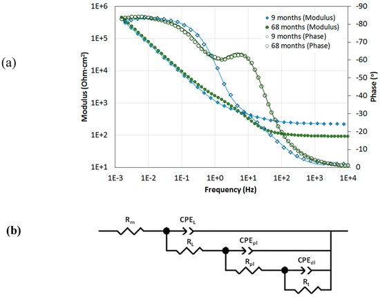 With the aim of checking the validity of the corrosion trend suggested by the Ecorr and obtaining more information about the real corrosion rate of the samples and their passivation mechanism, a complete EIS study was carried out at the same time during the testing period. Spectra such as those shown in the examples in Figure 6a were obtained during the study. To achieve a proper simulation of this experimental behavior, it was checked that the equivalent circuit plotted in Figure 6b was necessary. This equivalent circuit comprises (in series with the mortar resistance (Rm)) three time constants. The lowest-frequency time constant has often been identified with the charge transfer process taking place on the surface of stainless steel rebars, Rt being the charge transfer resistance and CPEdl the constant phase element used to simulate the non-ideal capacitive behavior of the double layer. The medium-frequencies time constant is identified with the electrical behavior of the passive layer formed on the reinforcements, Rpl and CPEpl being the resistance and the constant phase element used to simulate the resistive and the non-ideal capacitive behaviors of this layer. The identification of the phenomenon taking place at low and medium frequencies is a controversial point in the previous literature, as some studies have identified the charge transfer process with that occurring at medium frequencies [25], while others have identified it with that occurring at high frequencies [12]. The authors consider that if Rpl would be on the order of magnitude of the resistance at low frequency, the ohmic drop at the surface of the passive materials would be huge, and this is not the case.