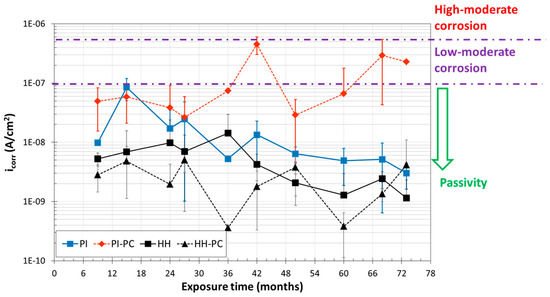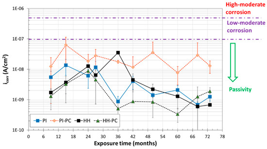 The results regarding the icorr measured for S32001 reinforcements can be seen in Figure 8. The PI-PC condition was confirmed to be especially dangerous for the cheapest grade under study. Meaningful icorr values were occasionally measured for this low-alloyed duplex stainless steel in this condition (after 42 months and at the end of exposure for the three tested rebars, and also after 68 months for two of them). The S32001 steel in PI condition had a single icorr value slightly higher than 0.1 μA/cm2, and this point corresponds to an Ecorr in the range of uncertain corrosion activity, although there were other Ecorr values for S32001 in PI treatment in the range of uncertain corrosion activity whose icorr clearly corresponded to passive reinforcements. Previous results in fully carbonated solutions have already suggested that S32001 grade steel could suffer chloride-induced corrosion in this media [18]. However, the values obtained for S32001 reinforcements in PI suggest that the higher chloride content in the mortar than in the HH-PC could more strongly affect the icorr than the decrease in the alkaline reserve performed in this study before the exposures. Pitting corrosion has already been reported for S32001 when the bars were embedded in extremely porous chloride-contaminated mortar [19].
