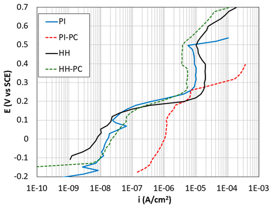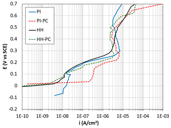 After six years of exposure in HH, HH-PC, and PI treatments, S32304 samples exhibited a very stable passivity (Figure 9). However, after exposures in PI-PC, the samples increased their current density when they were submitted to very small anodic overpotentials, reaching values about 0.3–0.5 μA/cm2. This could be considered a worrisome situation if very-long-term durability is expected, as the values are close to corrosion rates that could be considered high or moderate [43]. Moreover, intense pitting activity was also detected at very high anodic overpotentials (+625 mV vs. SCE in the example in Figure 9), when a partial oxidation and dissolution of the passive layer had already taken place (at about 200 mV vs. SCE). This intense pitting attack appeared at such high anodic polarizations that its probability is very remote in practice.