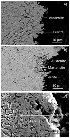 However, in very hard strained regions of the surface (e.g., corrugations or nerves), the ferrite—which is substantially less ductile than the austenite—accumulated much more strain during the working process. These very high stress concentrations in the ferrite decreased the corrosion resistance of this phase, while the decrease caused in the austenite by the strain was not as high. Hence, the relative corrosion resistance of austenite and ferrite reversed in the most strained regions of the surface of the bars. In the pits formed in very strained regions, the ferrite corroded selectively, while the austenite (partially transformed into strain-induced martensite [46]) remained uncorroded (Figure 12b). The selective dissolution of ferrite has already been reported for high-strength lean duplex bars (i.e., high-strained) when they were tested in simulated pore solutions [18].
