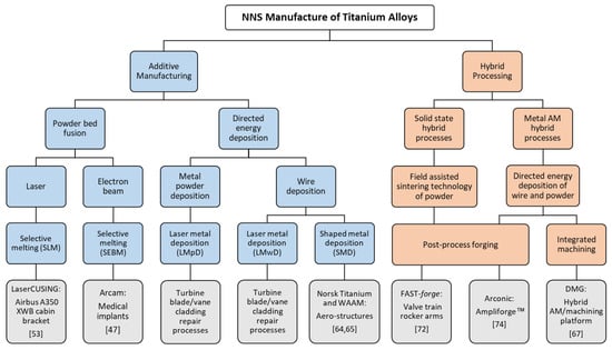 This review evaluates a selection of emerging NNS manufacturing processes suitable for the manufacture of titanium alloy components. Compared to conventional manufacturing routes, these processes can produce more cost effective NNS titanium alloy components with more efficient material utilisation. The review considers processes such as powder bed fusion and directed energy deposition AM processes, as well as hybrid processing routes. A comparison between the merits and challenges of each of these techniques is given, which suggests that powder bed fusion processes such as SLM and SEBM are well suited for the production of smaller, highly geometrically complex components such as medical implants. Conversely, direct energy deposition processes show more promise for the manufacture of larger scale components and have the potential to become more widely adopted for the manufacture of aerospace structures.