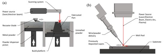 Schematic representation of: (a) powder bed fusion; and (b) directed energy deposition metal additive manufacturing processes.