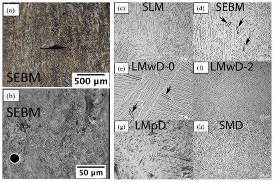 Microstructural features of SEBM additive Ti-6Al-4V: (a) irregular pore attributed to lack of fusion; and (b) spherical pore attributed to gas trapped within the powder feedstock. Microstructures of Ti-6Al-4V showing a basketweave type structure produced by the following additive processes: (c) SLM; (d) SEBM; (f) LMwD (with a 2-min dwell time between deposited layers); and (h) SMD. Ti-6Al-4V produced by: (e) LMwD (with no dwell time between sequentially deposited layers) showing a Widmanstätten type structure; and (g) LMpD showing a martensitic structure. In (c–h). the residual phase appears dark between the platelets. Images in (a,b) and (c–h) reproduced with permission from Cunningham et al. [] and Neikter et al. [], respectively.