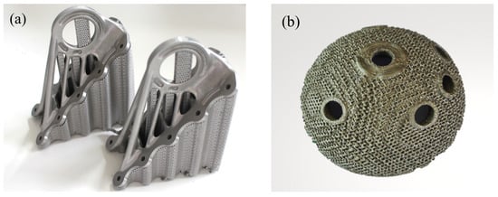 Titanium components manufactured by powder bed fusion metal additive manufacturing processes: (a) Airbus A350 XWB cabin bracket built by GE Additve’s LaserCUSING® SLM additive manufacturing process. (b) Medical implant built using Arcam’s SEBM technology at the University of Sheffield. Image in (a) reproduced with permission from GE Additive Concept Laser [].