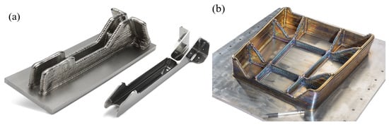 Titanium components manufactured by wire additive processes: (a) Boeing 787 structural component manufactured by Norsk Titanium’s Rapid Plasma Deposition™ process; and (b) Bombardier external landing gear assembly manufactured by the WAAM process at Cranfield University. Images in (a,b) reproduced with permission from Norsk Titanium [] and Cranfield University [], respectively.