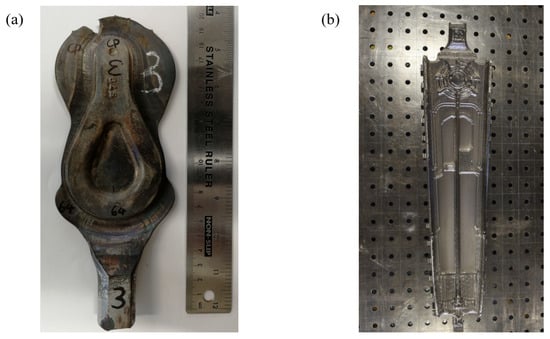 Titanium components manufactured by hybrid processing routes: (a) eye-bolt manufactured at the W.H. Tildesley, Wolverhampton and the University of Sheffield by the FAST-forge process; and (b) airframe structure manufactured by the Arconic Ampliforge™ hybrid AM-forging process. The image in (b) reproduced with permission from Arconic [].