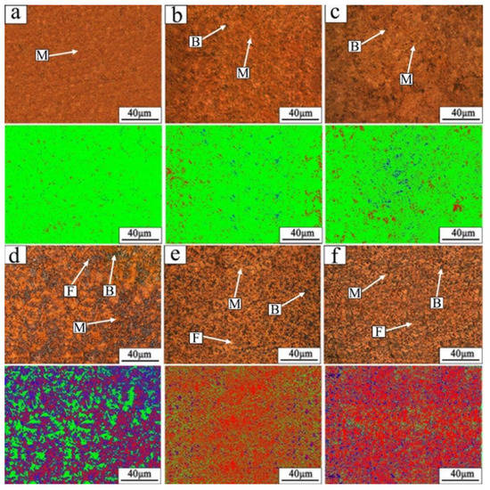 Figure 2 shows the locations of microstructure observation. C represents the cold zone and H is the hot zone. To identify and measure the content of the quenched phases, the specimens were mounted in epoxy resin, ground, and polished to a mirror finish, using 400, 1000, and 2000 grit SiC paper, followed by metallographic grinding paste. Two-stage color tint etching with 4% picral solution and 10% aqueous sodium metabisulfite solution was used to observe the quenched phases. After two-stage etching, the martensite was brown, the bainite was black, and the ferrite was white with an optical microscope. Martensite, bainite, and ferrite were manually set as green, red, and blue, respectively, by ImagePro Plus 7.0 software (Media Cybernetics, Inc., Rockville, MD, USA). The area fractions of quenched phases were quantified.