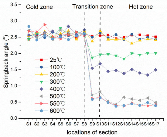 - The springback angle of the cold zone was large and remained unchanged with the increase of the heating tool temperature. When the heating tool temperature was higher than 300 °C, the springback angle of the hot zone decreased significantly. The springback angle was minimum and the change of it tended to be stable with the heating tool temperature over 550 °C.