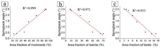 The relationship between the springback angle and the area fractions of martensite, bainite, and ferrite at different tool temperatures are shown in Figure 7. It can be seen that different quenched phases and their contents, caused by different tool temperatures, have great influence on the springback of the components. The springback angle shows a positive linear correlation with martensite and a negative linear correlation with bainite and ferrite. The correlation coefficient indicates that there is a noticeable linear correlation between them. With the springback angle as the dependent variable and the area fractions of martensite, bainite, and ferrite as the independent variable, a multiple linear regression analysis was carried out and the goodness of the fit, R-squared value is 0.985. The results show that there is a strong linear relationship between the springback angle and the area fractions of martensite, bainte, and ferrite. By the multi-step iterative optimization method, the relationship between the springback angle and the area fractions of quenched phases was established and is shown as Equation (1).