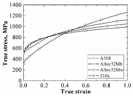 The same materials (A508, 52Mb, 52Mw and 316L) as the previous study were selected in this study. The true stress–strain curves of the four materials at room temperature [] were shown in Figure 1. The measured Young’s modulus E of them are 202, 410 MPa; 178, 130 MPa; 178, 130 MPa; and 156, 150 MPa, respectively, and the Poisson’s ratios ν is 0.3 for all of them [].