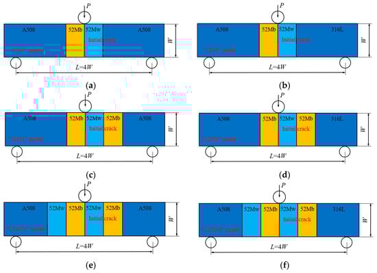Single-edge-notched bend (SENB) specimens were used in this study. For all the models, the specimen widths were 14.4 mm (W = 14.4 mm), the loading spans were 57.6 mm (L = 4W), the specimen thickness B was 12.0 mm, and the initial crack lengths were 7.2 mm (a/W = 0.5). The initial crack was located in the middle of the specimen, and the loading was applied at the load roll by prescribing a displacement of 6.0 mm.