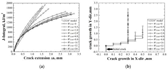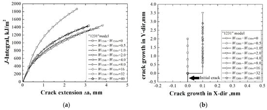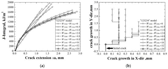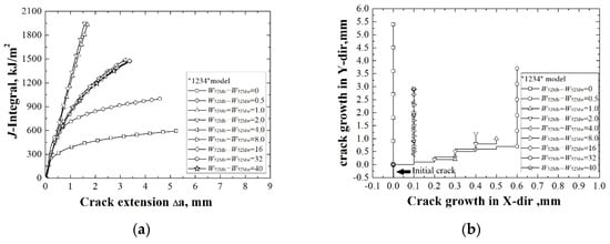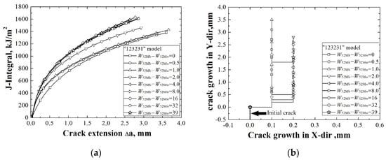 The J-resistance curves of different “1234” models under different material constraints are shown in Figure 4a. It can be found that by increasing the widths of 52 Mb and 52 Mw, the J-resistance curves of the models first increased, then decreased and remained steady at last. When the widths of 52 Mb and 52 Mw are 0.0 mm, the model has the lowest J-resistance curve. When the widths of 52 Mb and 52 Mw are 2.0 mm, the model has the highest J-resistance curve. When the widths of 52 Mb and 52 Mw up to 4.0 mm, the J-resistance curve will not change by increasing the widths of 52 Mb and 52 Mw.