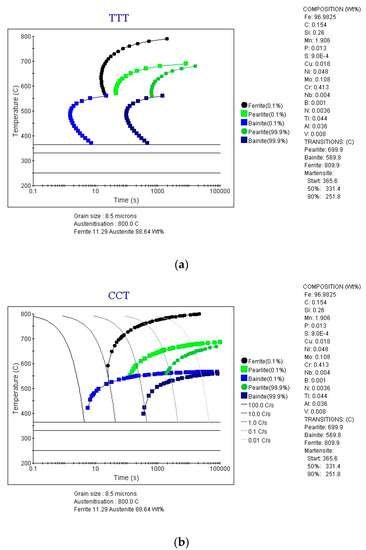 Calculated TTT (a) and CCT (b) diagrams for the steel investigated. The calculation was performed assuming a TIA = 800 °C.
