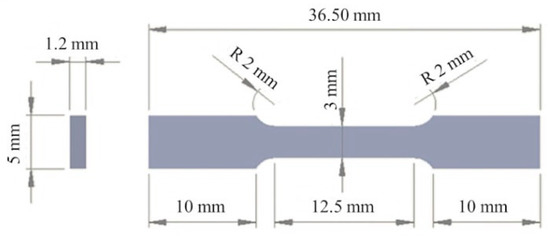 The thermal cycles (Figure 1) were simulated using a quenching dilatometer Linseis model L78 RITA (Selb, Germany). The experiments were carried out in both miniature tension test samples with dimensions presented in Figure 3, and standard test samples of 5 mm × 11 mm × 1.1 mm for microstructure and microhardness analysis. The tensile tests were performed using a miniature extensometer (MTS System Corporation, Eden Prairie, MN, USA) MTS model 632.29 with a 5 mm calibrated gauge length. This extensometer has a strain measuring the range of −10% to 30%, which is perfectly adequate for the tensile test specimens designed for dilatometry. The tensile tests carried out using an electromechanical universal testing system MTS model QTEST/100 (MTS System Corporation, Eden Prairie, MN, USA) at a crosshead speed as 1.5 mm/min. Experimental data were obtained to provide ultimate tensile strength (UTS), yield strength (0.2% proof stress) and elongation to fracture (EL). Al experiments were performed by duplicate.