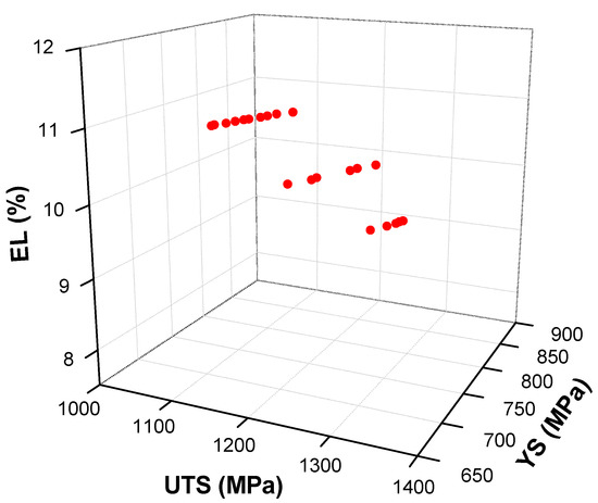 Of the 21 optimal solutions presented in Figure 4, five conditions were selected to corroborate de optimization experimentally and the mechanical properties results are presented in Table 8. The criterion for selecting the conditions for the experimental test was that they should comply with a minimum UTS of 1100 MPa, YS between 550 and 750 MPa and a minimum elongation of 10%.