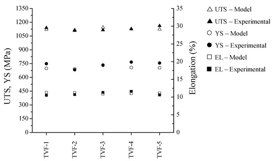 The five conditions selected were run experimentally using the miniature tensile test specimens designed to perform dilatometry thermal cycles. The mechanical properties were measured, and their results compared with those calculated by the model (Figure 5). The error in the prediction of the UTS is less than 3.4%, in the YS it is less than 7.7% and that of the elongation to fracture is less than 7.6%. These results indicate that the models obtained have a very good predictive capacity since they present errors of less than 10% [31].