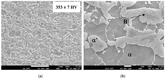 Microstructure of TVF-3 heat treated sample: (a) 2500× and (b) 10,000×; B: Cainite; α: Ferrite and α’: Martensite.