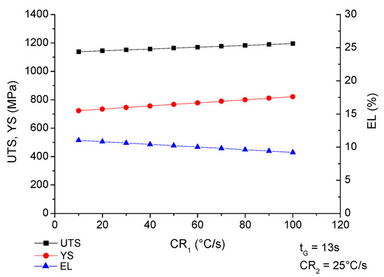 In the manufacturing of galvanizing DP-AHSS steels, the cooling rate (CR1) must be fast enough to avoid the formation of perlite or bainite and retain carbon in solution in the metastable austenite until the transformation to martensite takes place at T < Ms. With the statistical models developed in this work (Equations (6)–(8)) it is possible to predict the effect of CR1 over the mechanical properties to DP steel, as shown in Figure 7. To plot this graph, the secondary cooling rate (CR2) was kept constant at 25°C/s and tG at 13 s. As can be seen, both the UTS and YS tend to decrease with slower initial cooling rates (CR1).