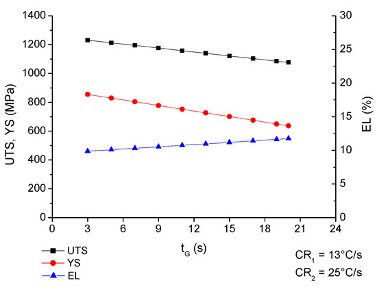 As can be seen in the calculated TTT or CCT diagrams of Figure 2, interruption of cooling at 460 °C causes an isothermal transformation of metastable austenite to bainite. Therefore, the UTS and YS at room temperature of the steel will decrease with increasing tG since smaller amounts of martensite would be present at room temperature after the final cooling.