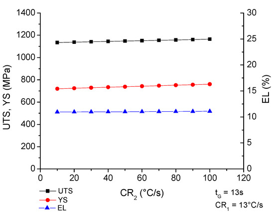 It can be seen in Figure 9 that the final cooling rate (CR2) does not significantly influence the final mechanical properties. This result is similar to that reported by other researchers [1], who suggest that this final cooling rate (CR2) does not have a significant influence on the strength of the steel. The reason for this suggestion is that the amount of martensite generated is determined by the initial cooling rate in thermal cycles to obtain DP-steels without interrupted cooling at 460 °C. However, in this work, the isothermal holding at 460 °C prior to the final cooling produces residual metastable austenite with more carbon compared to the intercritical austenite and then the final rate for the transformation of the residual austenite has a significant effect in the UTS. Furthermore, using HR1 = 35 °C/s; TIA = 800 °C, t2 = 60 s; CR1 = 13 °C/s, TG = 460 °C and tG = 13 s, it is possible to obtain a galvanizing DP steel with minimum UTS of 1100 MPa, YS between 550 and 750 MPa and a minimum elongation of 10% with the final cooling rate (CR2) between 10 and 70 °C/s.