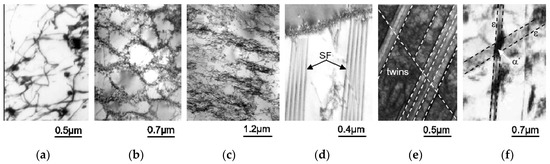 TEM micrographs with deformation and transformation microstructures of cyclically loaded metastable austenitic stainless steels: (a) typical dislocation density of the initial state after solution annealing, AISI 348 [58]; (b) cell dislocation structure (wavy slip character) at Nf in AISI 348 fatigued with σa = 280 MPa, R = −1 at AT with f = 5 Hz [58]; (c) dislocation accumulation in one direction (planar slip character) at Nf in AISI 348 fatigued with σa = 260 MPa, R = −1 at AT with f = 5 Hz [58]; (d) stacking faults (SF) at Nf in AISI 304 fatigued with εa,t = 0.325%, R = -1 at AT with f = 5 Hz [58]; (e) twins in AISI 347 fatigued with σa = 160 MPa, R = −1 at T = 300 °C with f = 980 Hz at N = 5 × 108, (f) ε- and α´-martensite at Nf in AISI 321 fatigued with σa = 330 MPa, R = −1 at AT with f = 5 Hz [59].