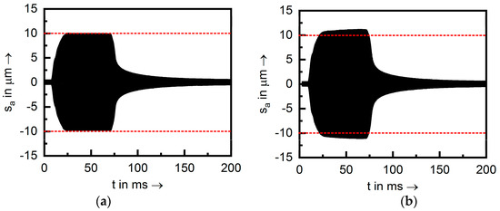 Displacement amplitude of batch A during VHCF testing at (a) the beginning of the fatigue test and (b) after fatigue-induced α’-martensite formation occurred without parameter adjustments.