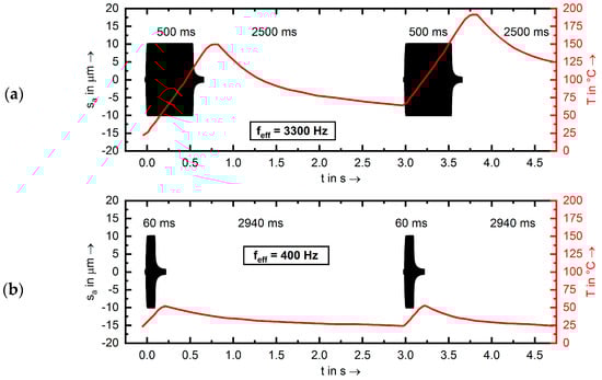 Development of the specimen’s temperature using a pulse/pause ratio of (a) 0.5 s/2.5 s and (b) 0.06 s/2.94 s for AISI 347 batch A.