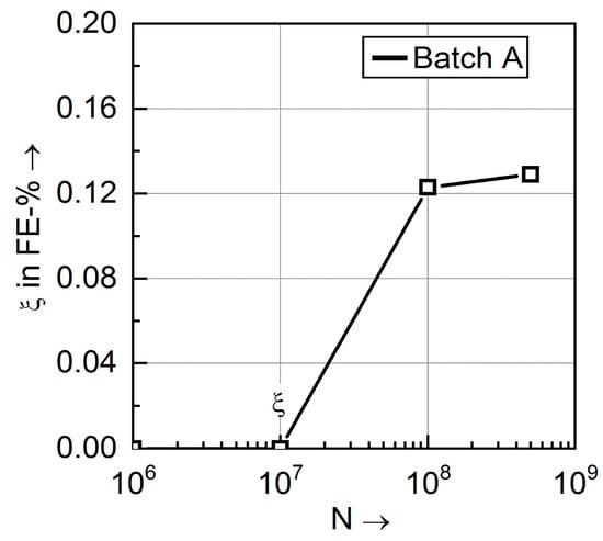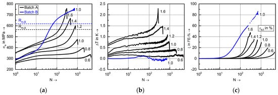 For fatigue tests in the HCF regime, stress-controlled single step tests were performed. Typically, in order to obtain the limited number of cycles Nl in the range of 106–107 cycles, test frequencies in the range 5 Hz ≤ f ≤ 20 Hz are used for metallic materials. For Nl = 2 × 106 with a load frequency of f = 5 Hz, about 5 days, for Nl = 2 × 107 with a load frequency f = 20 Hz, about 12 days would be required. Usually, higher test frequencies can be used for HCF tests at ambient temperature (AT) of metallic materials but when investigating the fatigue behavior of metastable austenitic stainless steels, self-heating of the specimens has to be taken into account. Even if external cooling of the specimen is undertaken, significant increases in specimen temperature cannot be suppressed [70,71]. Hence, in this study, test frequencies for fatigue tests at nominally ambient temperature were f = 5 Hz (batch B) and for T = 300 °C f = 20 Hz (batch A).