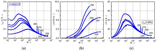 To characterize the cyclic deformation and transformation behavior during cyclic loading in the HCF regime, specimens taken from batch B were cyclically loaded in stress-controlled single step tests with stress amplitudes in the range 225 MPa ≤ σa ≤ 280 MPa. In Figure 8a the resulting developments of plastic strain amplitude εa,p are plotted against the number of cycles N. The εa,p,N curves illustrate pronounced cyclic hardening after a short period of initial cyclic softening. Cyclic hardening is caused by an increase in dislocation and stacking fault density, as well as by formation of deformation-induced α´-martensite (Figure 8b). A positive influence of α´-martensite formation on fatigue life was observed, because austenite-α´-martensite transformation causes cyclic hardening, which significantly reduces plastic strain amplitude. Similarly, total-strain controlled fatigue tests in the LCF regime (Figure 6), after an incubation period dependent on stress amplitude, resulted in a continuously increasing volume fraction of α´-martensite over the number of cycles. With increasing stress amplitude, the onset of α´-martensite formation was shifted to lower N and higher α´-martensite fractions were measured at specimen failure. This development of α´-martensite in stress-controlled tests was comparable to the results given in [16] as well as for total-strain controlled fatigue tests shown in Figure 6c. However, with 1.7 FE% < ξ < 8.8 FE% the maximum values of α´-martensite at specimen failure/ultimate number of cycles were significantly lower compared to total strain-controlled LCF tests. The change in the specimen temperature during the fatigue tests is shown in Figure 8c. As in the LCF tests, changes in temperature were used to detect cyclic deformation behavior. However, in the stress-controlled fatigue tests, an increase in temperature correlated with an increase of the σ-ε hysteresis loop area, indicating cyclic softening, whereas a decrease in temperature correlated with a decrease of the σ-ε hysteresis loop area, and characterized cyclic hardening. Besides using ΔT to characterize cyclic deformation behavior, information about the general amount of self-heating is provided (Figure 8c). In consideration of Equation (4), a maximum specimen temperature of 102 °C was achieved while the value of ΔT signal shows 53 K. As is known, temperature has a significant influence on deformation-induced α´-martensite formation and consequently fatigue life. In literature [5,72,73,74,75,76,77,78,79] the fatigue life of metastable austenitic stainless steels is given as S-N curves obtained by fatigue testing with load frequencies up to 150 Hz. Obviously, specimen temperatures in HCF tests with frequency higher as 2 Hz were higher than ambient temperature; however, the information about the specimen temperatures is not at all times given. To obtain HCF results at true AT or at temperatures around 25 °C–30 °C, fatigue tests with significantly lower frequency, e.g. f = 0.2 Hz, have to be performed. This requires 115 days of test duration to achieve NL = 2 × 106, i.e. a duration that is impractical for systematic investigation of HCF behavior due to high resource expenses. In conclusion, to obtain representative results in the HCF regime in a reasonable time, it is necessary to perform fatigue tests of metastable austenite with variable test frequencies during single step fatigue tests, which effectively suppress self-heating of e.g. ΔTmax < 10 K. Therefore, it has to be noted that the presented results (and many others given in literature [5,72,73,74,75,76,77,78,79], especially regarding the development of α´-martensite and its influence on fatigue life) are influenced by specimen temperature, which needs to be taken into consideration.