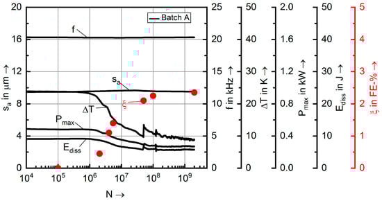 Displacement amplitude sa, frequency f, temperature change ΔT, power P, dissipated energy Edis and α’-martensite content ξ of batch A during VHCF test at σa = 250 MPa.