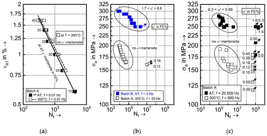 Development of (a) plastic strain amplitude εa,p, (b) α’-martensite and (c) change in the specimen’s temperature ΔT versus load cycles N during HCF tests at AT with f = 5 Hz of batch B.