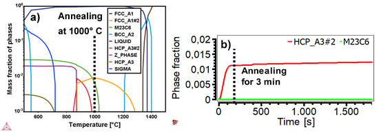 Thermodynamic calculations and precipitation kinetics. (a) Mass fraction of equilibrium phases diagram vs. temperature showing that austenite (FCC_A1), carbides (M23C6-type), and nitrides FCC_A1#2 (MN-type) are the equilibrium phases at 1000 °C (Thermo-Calc TCFE 9, MOBFE4). (b) Precipitation kinetics at 1000 °C showing the formation of HCP_A3#2 (M2N-type) which comes up to saturation within 3 min (MatCalc version 6.02).