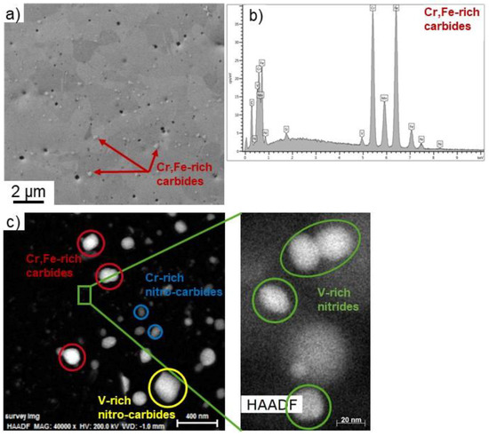 The thermomechanical processing of the MMn steel resulted in a fine-grained and recrystallized austenitic microstructure containing a considerable amount of precipitates as observed from the SEM image shown in Figure 2a. For the relatively large particles (<150 nm), the EDX-point analysis was applied to reveal their approximate alloying contents. The EDX-spectra represented in Figure 2b shows that the relatively large particles resemble Cr,Fe-rich carbides. The SEM observations and particle analyses are in accordance with the Thermo-Calc equilibrium calculations (Figure 1a). However, the expected precipitation kinetics conducted by MatCalc (Figure 1b) contradicts the formation of Cr-rich carbides during annealing at 1000 °C for 3 min. Instead, it supports the formation of V-rich nitrides. TEM and STEM/EDX investigations confirmed the presence of Cr,Fe-rich carbides (Cr:Fe atomic ratio of 4:1) and Cr,V-rich nitro-carbides (V:Cr atomic ratio of 1:2) as well as V,Cr-rich nitro-carbides (V:Cr atomic ratio of 5:1) with particle sizes of 100 to 150 nm, as indicated in the STEM HAADF image in Figure 2c. Moreover, V,Cr-rich nitro-carbides (V:Cr atomic ratio 5:1) were identified with a relatively larger particle size of ~200 to 400 nm. Additionally, very fine V,Cr-rich nitrides (V:Cr atomic ratio 5:1) with a particle size of <20 nm were observed (in accordance with Thermo-Calc calculations) as depicted in the inset of Figure 2c.