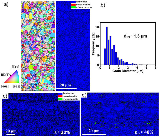 Figure 3 represents the analyses of the EBSD measurements for the MMn steel with and without deformation. The orientation and phase maps in the as-annealed state (in Figure 3a) show that the applied annealing treatment at 1000 °C for 3 minutes resulted in an ultrafine recrystallized austenitic microstructure without a pronounced texture. The average grain size of the adjusted microstructure is around 1.3 µm according to the grain size distribution shown in Figure 3b. The developed austenite microstructure remains mechanically stable after straining to 20% elongation in a tensile irrupted test without any indication for either transformation-induced plasticity (TRIP) nor TWIP effects. However, the specimen pulled until the fracture (with a total elongation of ~48%) showed low amounts of less than 1% ε-martensite (in red) and approximately 2% α’-martensite (in green) at dispersed regions. Deformation twins were not observed at any deformation stage under the applied resolution during EBSD measurements. The corresponding phase maps recorded in the direction of tensile axis for both deformed states, i.e., at 20% elongation and at fracture strain, are shown Figure 3c,d, respectively.