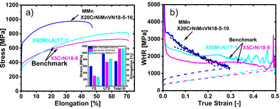 Tensile properties of the MMn steel X20CrNiMnVN18-5-10 in comparison to the benchmark stainless steel X5CrNi18-8 and TWIP steel X60MnAl17-1. (a) Engineering stress–strain curves with a bar chart showing the achievable strength and ductility levels. (b) The work hardening rate (WHR) curves.