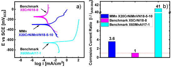 Dynamic polarization measurements in 5% NaCl showing the corrosion properties of the MMn steel compared to the benchmark steels. (a) Recorded polarization curves. (b) The corrosion current ratio with respect to the benchmark stainless steel X5CrNi18-8.