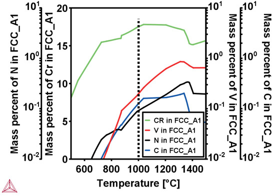 There are additional effects caused by V alloying that act in a close interplay with nanoprecipitates on improving the YS of the MMn steel. As observed from the grain size distribution in Figure 3b, the annealing treatment at 1000 °C for 3 min resulted in a recrystallized and ultrafine grained microstructure that contributes to the increase in yield strength, which is commonly referred to as the Hall–Petch effect [34,35]. In addition to Ashby–Orowan and Hall–Petch effects, solid–solution strengthening due to the dissolved V and N solutes contributes to the YS value of the MMn steel. As can be noted from Figure 6, the thermodynamic equilibrium austenite at the applied annealing temperature still contains around 0.2 and 0.1 wt.% of dissolved V and N solutes, respectively. Norström [36] demonstrated a significant increase in yield strength of N-alloyed stainless steel due to the solid solution-hardening effect. Moreover, Werner [37] established that the increment in yield strength due to solid–solution strengthening of N-alloyed stainless steel was considerably higher than that achieved by grain refinement at the same amount of N.