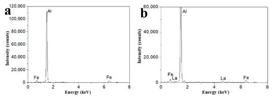 - Mi, G.F.; Dong, C.F.; Zhao, D.W. Effect of different cooling speed and rare earth La on the microstructures and phase constitution of Al-Fe alloy. Appl. Mech. Mater. 2010, 44–47, 2126–2130. [Google Scholar] [CrossRef]