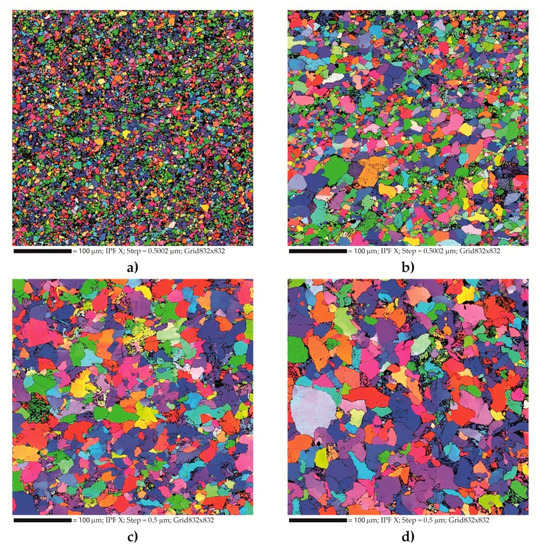 After temperature exposure, the samples were cut in the middle and metallographically prepared for EBSD analysis to evaluate their grain size with an electron microscope (HV 30 kV; beam intensity 18; WD 12.9 mm). A total of 3 areas of 450 × 450 µm2 were scanned on each sample. Figure 2 show the results of EBSD analysis on samples with temperatures of 900, 1000, 1100, and 1200 °C and a soaking time of 2 h. The mean grain size in µm (determined as the average from three measured areas) is given in Table 2 for all types of samples.