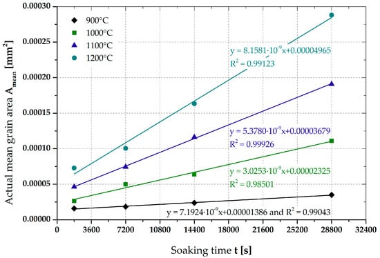 The way to obtain values D0 and KT is shown in Figure 3. The graph shows, for the individual temperatures of the experiment, the average mean values of grain size (Table 2) obtained experimentally or, more precisely, their second squares representing the mean grain areas. Each of the exposure temperatures in the graph is expressed by a trend line and its equation. From the slope of the trend line, it is then possible to deduct the value of each partial exponential constant KT as well as the initial grain size D0.