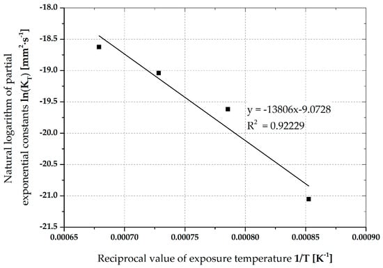 The method of determining the grain growth activation energy Q as well as the total exponential constant K0 is apparent from Figure 4. The graph shows the values of the natural logarithm for determined partial exponential constants KT in dependence on the reciprocal values of exposure temperatures expressed in kelvin [T−1]. As a result, a trend line can be created, and its equation is expressed in the following format (6).